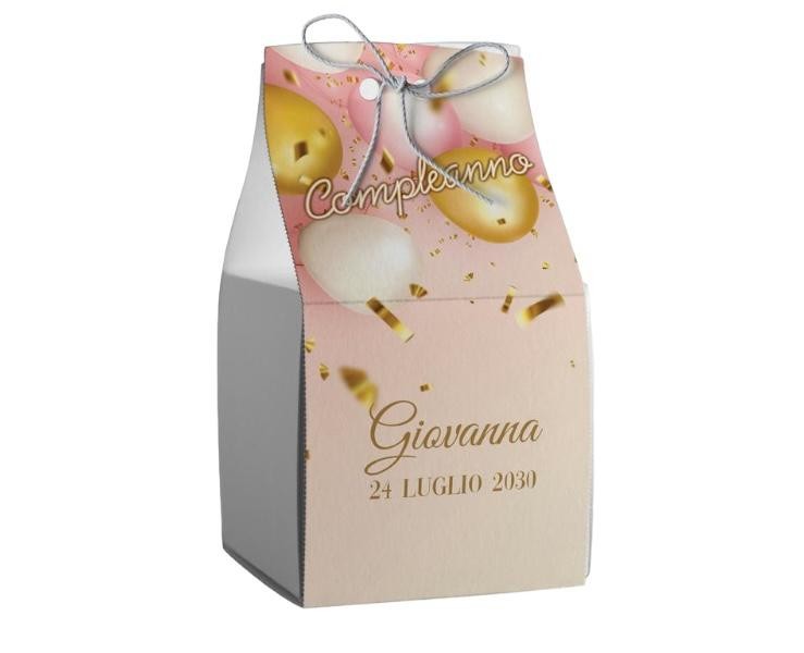Scatolina porta confetti personalizzata quadrata rosa con palloncini oro rosa