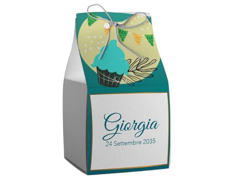 Scatolina porta confetti personalizzata quadrata blu con dolcetto e bandierine