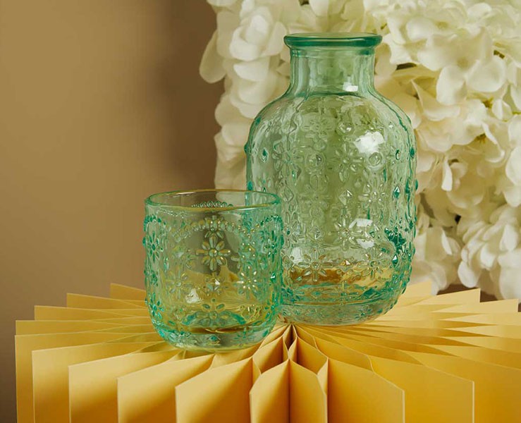 Il Set Caraffa con Bicchiere in Vetro Verde è un accessorio affascinante che unisce la funzionalità al fascino del design retrò. Realizzato in vetro verde/verde acqua (o verde menta) con finitura trasparente, si distingue per la sua bellissima lavorazione a rilievo floreale/geometrica che gli conferisce un aspetto unico e tattile.