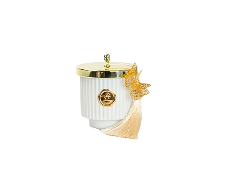 La Candela Harmony White rappresenta la quintessenza dell'eleganza per la casa. Il vetro bianco latte, dalla finitura setosa, è lavorato con una texture a coste verticali che dona movimento e un tocco di modernità classica. La combinazione cromatica tra il bianco candido e l'oro lucente dei dettagli metallici rende questo oggetto un punto luce sofisticato, capace di integrarsi perfettamente in ogni ambiente, dal minimalista al barocco.