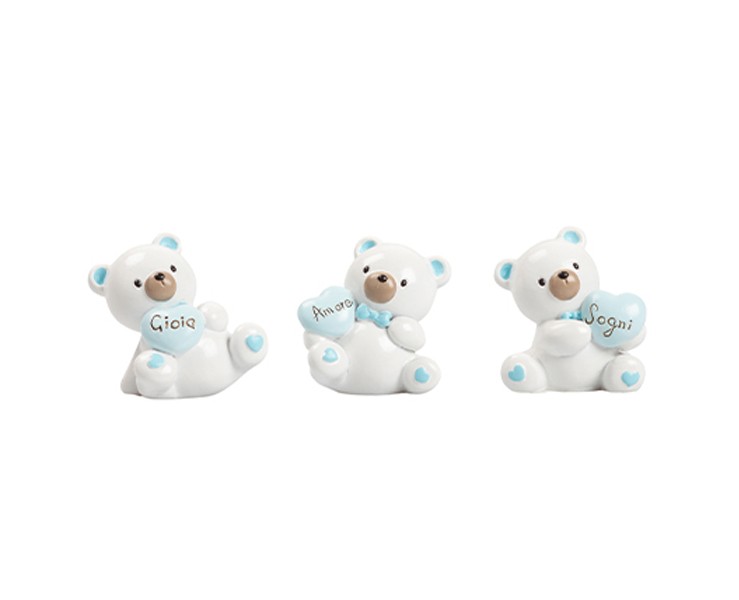 Questi piccoli Orsetti Baby Boy 3D sono miniature cariche di significato, pensate per trasformare una bomboniera in un augurio speciale. Ogni statuina, curata nei minimi dettagli, stringe a sé un cuore che porta un messaggio diverso, creando un trittico di emozioni — Amore, Gioia e Sogni — che celebra la bellezza e la purezza di una nuova vita.