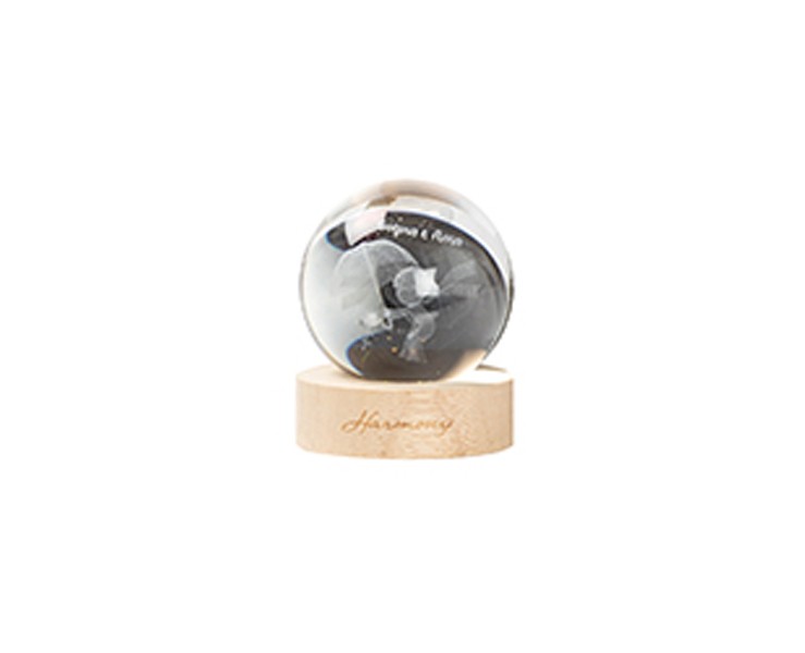 Base Naturale: La sfera poggia su una base circolare in legno chiaro naturale, che dona calore all'oggetto e riporta l'incisione del logo "Harmony" con un tocco artigianale.