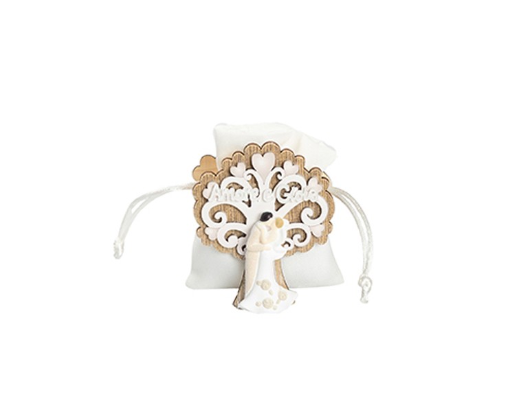 Coppietta Sposi: Frontalmente è applicata una tenera statuina in resina che raffigura una coppia di sposi in un abbraccio, sormontata dalla scritta beneaugurante "Amore e Gioia".