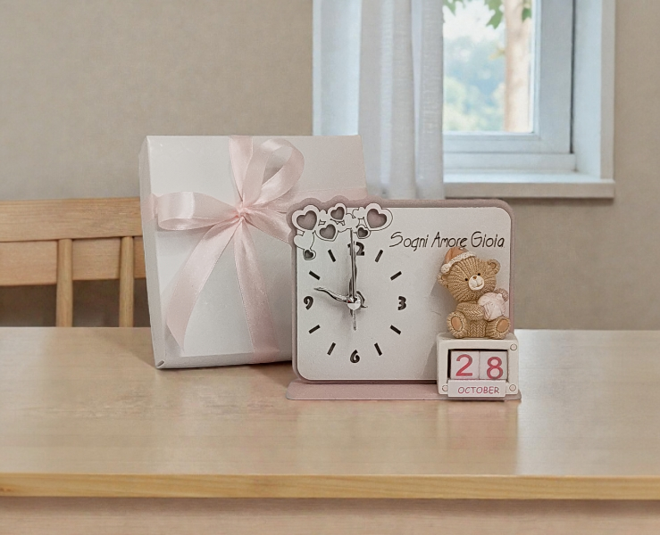 La struttura rettangolare con angoli smussati presenta un quadrante bianco con numeri e indici neri ben visibili per una facile lettura. Sul lato destro spicca un'applicazione in rilievo: un simpatico orsetto seduto sopra un calendario a cubetti, che permette di impostare manualmente il giorno e il mese. La parte superiore è impreziosita da una cascata di cuoricini intagliati, mentre la frase "Sogni Amore Gioia" incisa sul quadrante porta un messaggio beneaugurante in ogni stanza.