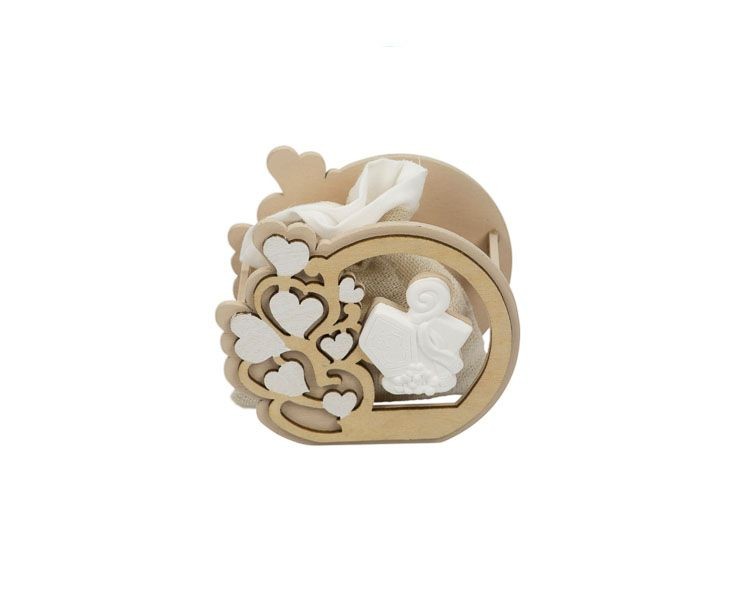 Questo porta confetti strutturato si distingue per l'armonioso accostamento tra il calore del legno naturale e la purezza della resina bianca, offrendo una bomboniera che funge anche da piccolo oggetto d'arredo sacro. Il design traforato e l'attenzione ai dettagli rendono questa proposta una scelta di classe per chi desidera trasmettere i valori della fede attraverso materiali organici e raffinati.