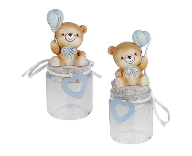 Statuina Orsetto in Resina: Ogni barattolo è sormontato da un simpatico orsetto seduto, rifinito con dettagli minuziosi e un tenero fiocchetto azzurro al collo.