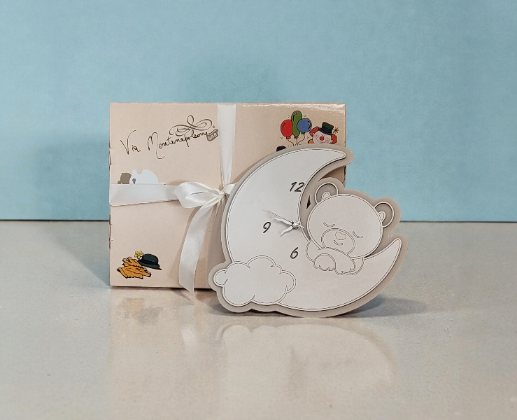 L'opera è realizzata in legno con una delicata finitura color sabbia e panna, che richiama un'atmosfera di pace e serenità. La silhouette ritrae una grande luna crescente che accoglie al suo interno un quadrante minimale e leggibile. Un piccolo orsetto, inciso con un tratto morbido e sognante, dorme beatamente appoggiato a una nuvola soffice che spunta dalla base della luna. Il movimento delle lancette è studiato per essere discreto, perfetto per non disturbare i sogni dei più piccoli.