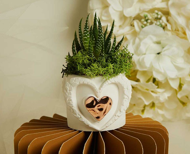 Bomboniera Claraluna 2026 Vasetto grande Cuore Claraluna con Applicazione Oro Rosa e Piantina Grassa