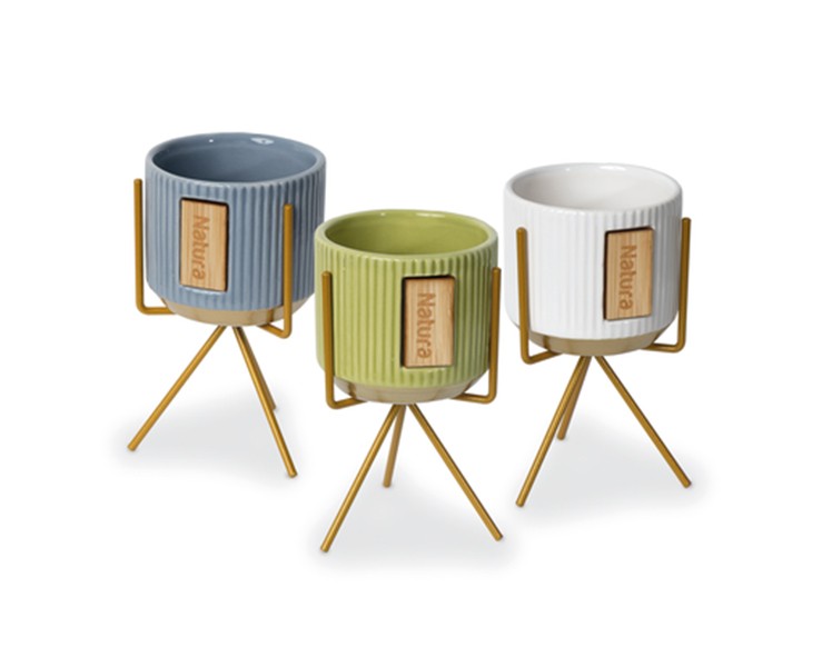 Eccellenza Artigianale e Design: Il set è composto da un vasetto in ceramica con una raffinata texture plissettata a rilievo, sorretto da uno stand in metallo dorato dalla linea minimalista a tre piedi. Questo supporto solleva la pianta, donandole slancio e importanza. Ogni vaso è rifinito con una placchetta in legno naturale incisa con la parola "Natura" ed è disponibile in tre varianti cromatiche pastello: bianco candido, blu polvere e verde oliva. Con un'altezza complessiva di 13 cm, è la soluzione ideale per scrivanie, librerie o mensole moderne.