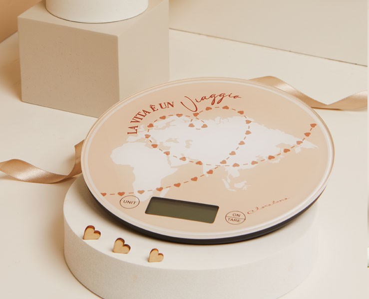 Per chi ama viaggiare e desidera portare un pezzo di mondo in cucina, questa bilancia elettronica tonda con il decoro "La vita è un viaggio" è la scelta perfetta. Funzionale e decorativa, ideale come bomboniera o regalo speciale.