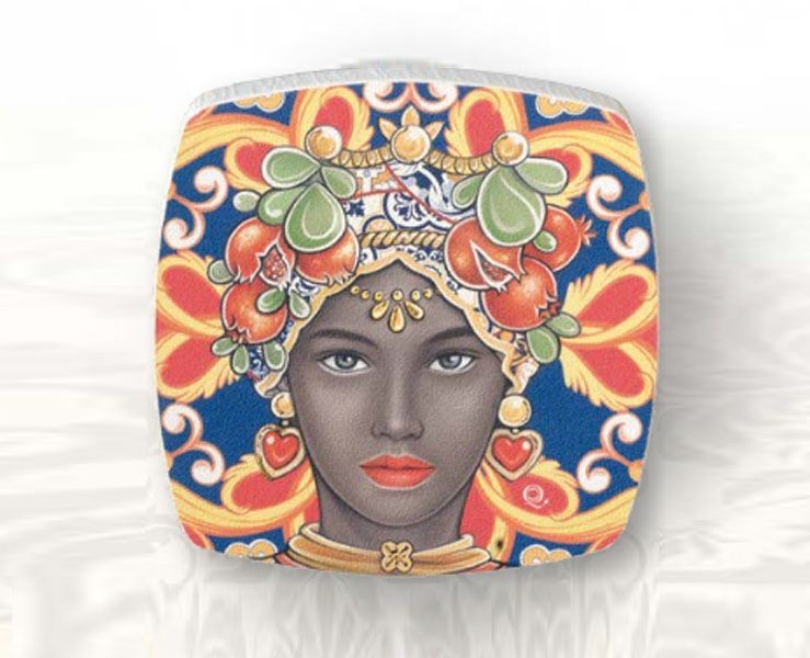 BOMBONIERA TESTA DI MORO DONNA COLORI NERO E ROSSA DA APPOGGIO DECORATO CON ORO