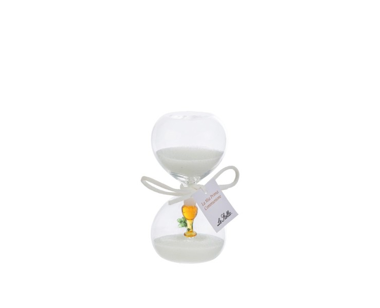 Un'elegante bomboniera in miniatura che racchiude il significato profondo della Comunione. Questa clessidra da 10 cm in vetro soffiato con sabbia bianca e dettagli sacri è il pensiero perfetto, compatto e raffinato, per i tuoi invitati. Include astuccio regalo.