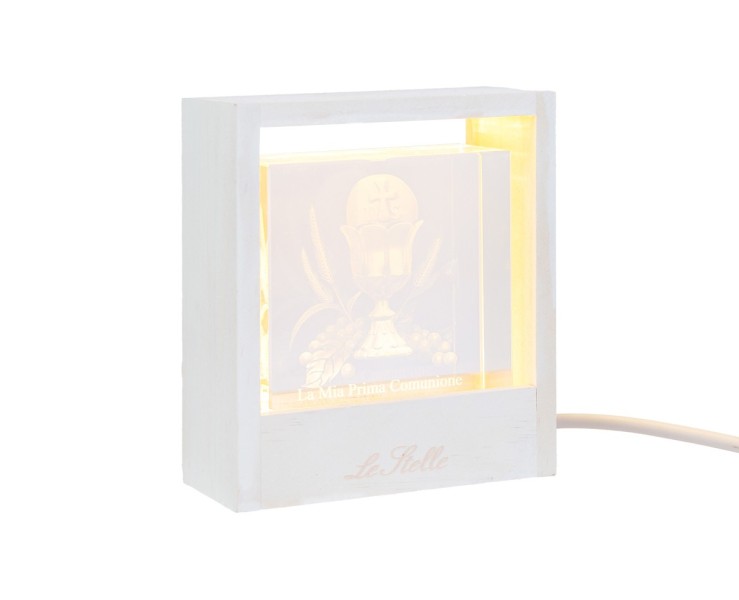 Illumina il giorno della Prima Comunione con questa elegante lampada a cubo. Un oggetto di design moderno in vetro inciso con i simboli sacri del Calice e dell'Uva, incorniciato in legno bianco. Alimentazione USB pratica e sicura, ideale come luce notturna o complemento d'arredo. Include astuccio regalo.