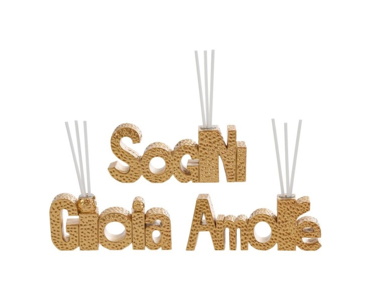 Elegante, luminoso e profondo. Questo diffusore di fragranze in resina dorata non è solo un accessorio per la casa, ma un messaggio di positività. Caratterizzato da scritte ispirazionali e una finitura gold è la bomboniera perfetta per chi desidera lasciare un segno di luce e armonia. Completo di bastoncini e raffinato astuccio regalo.