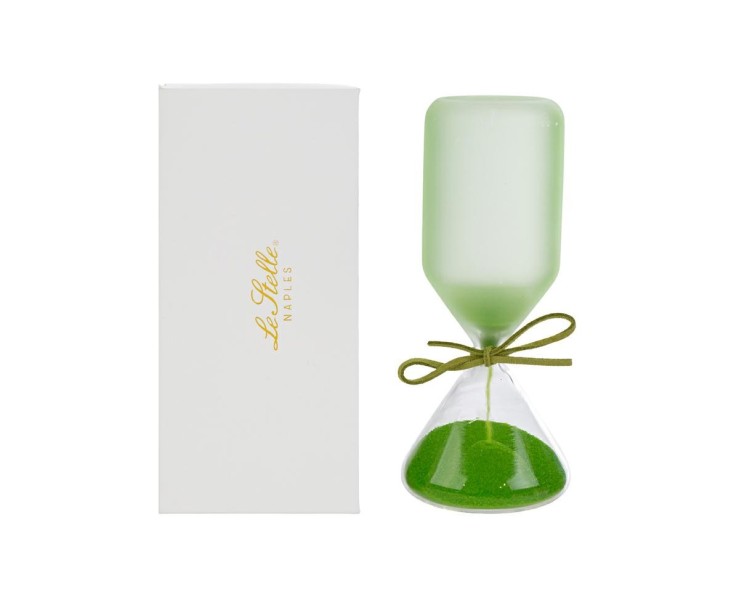 Questa clessidra in vetro si distingue per la sua particolare colorazione verde satinato, una tonalità ricercata che conferisce all'oggetto un aspetto organico e sofisticato. La finitura opaca rende la superficie vellutata al tatto, trasformando un classico strumento del tempo in un complemento d'arredo moderno e di classe.