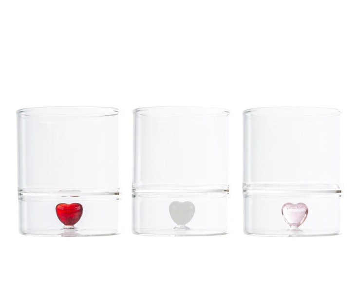 Il set di due bicchieri da 8 x 9,5 cm è una fusione di design moderno e sentimentalismo. La struttura cilindrica in vetro liscio e cristallino accoglie sul fondo un piccolo cuore colorato che sembra fluttuare nel liquido, creando un effetto visivo sorprendente e raffinato durante l'uso.