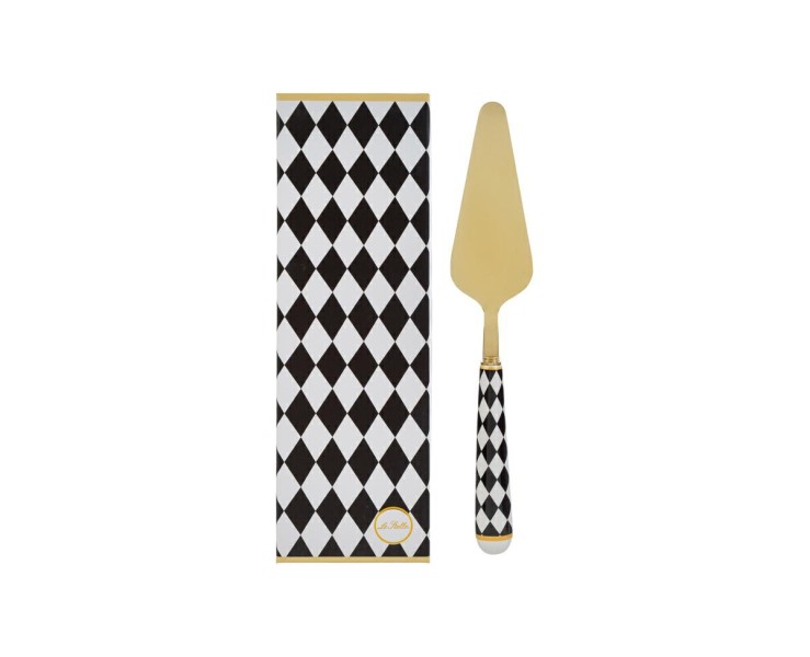 La paletta torta da 25 cm è un accessorio da portata che non passa inosservato, progettato per chi ama i dettagli che fanno la differenza. Realizzata in metallo di alta qualità, la superficie di servizio presenta una placcatura dorata integrale che riflette la luce, rendendo ogni momento del dessert una piccola cerimonia. Il manico, elemento distintivo della collezione, è impreziosito da un motivo geometrico a scacchi ("chess pattern") rifinito con eleganti bordure oro e una base arrotondata bianca.