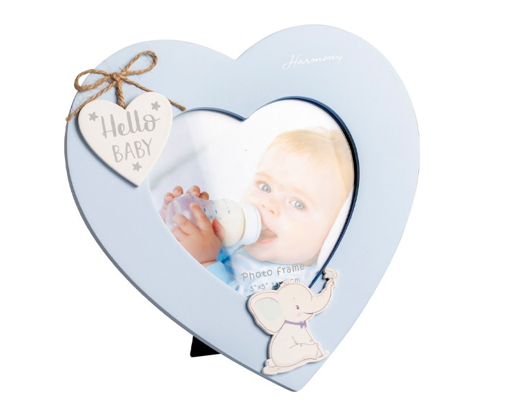 Dolcissimo portafoto in legno a forma di cuore, pensato per custodire i ricordi più belli del tuo bambino. Decorato con un tenero elefantino e un cuore con la scritta Hello Baby, è il regalo perfetto per una nascita, un battesimo o un primo compleanno.