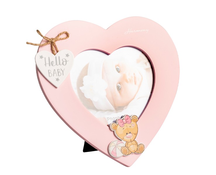 Dolcissimo portafoto in legno a forma di cuore, pensato per custodire i ricordi più belli del tuo bambino. Decorato con un tenero orsetto rosa e un cuore con la scritta Hello Baby, è il regalo perfetto per una nascita, un battesimo o un primo compleanno.