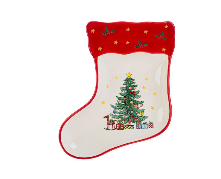 Vassoio in Ceramica a Forma di Calza con Albero di Natale 17,5x21xh.2,5 cm - Perfetto per le Feste